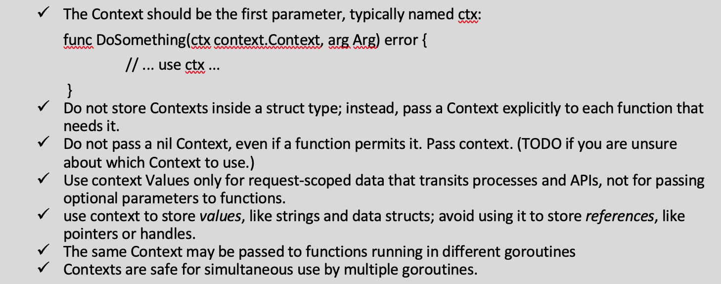 So, the core things to keep in mind with request-scoped values, cancellation signals, and deadlines across API boundaries to all goroutines, that they are handled with clean design. Which is described as cancellation and propagation.