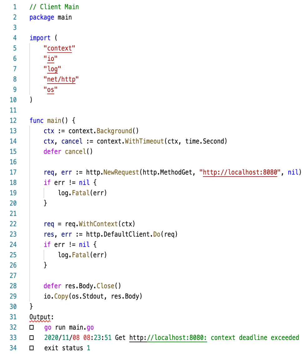 Finally, let’s look at cancellation and propagation between server and client. The server will listen on port 8080 for a client request, and when context got timed out on the client side. The server is then stopped, and returned. The client will send the request with context with timeout, once the timeout context deadline is exceeded and has exited.