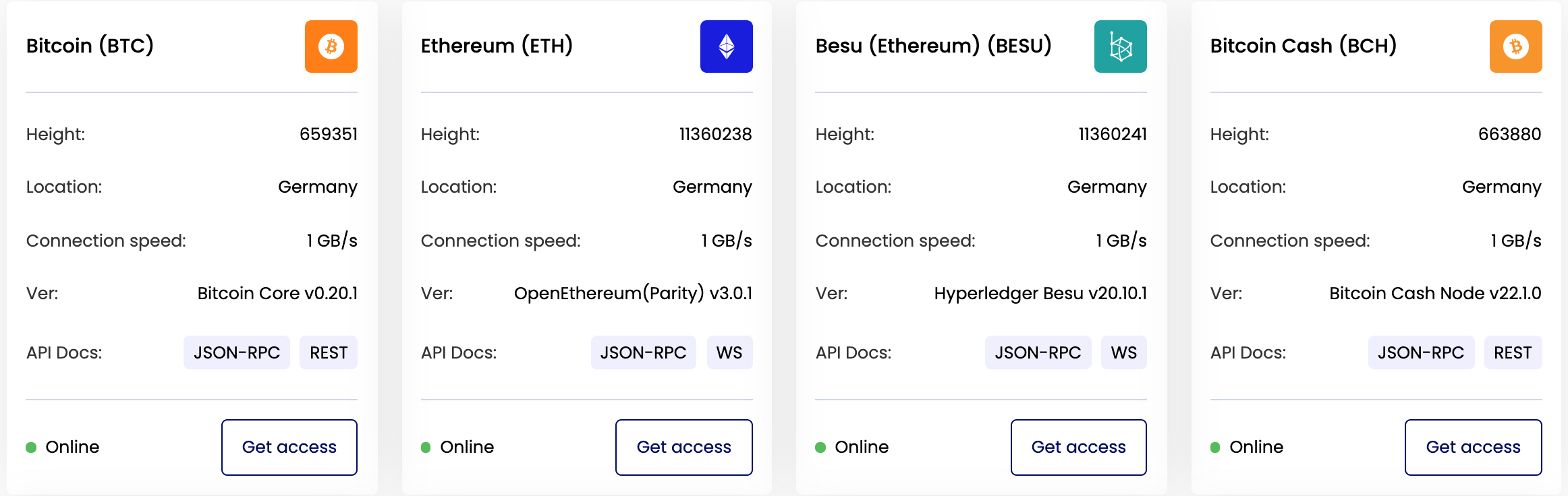 At the moment GetBlock supports nodes for Bitcoin (BTC), Ethereum (ETH), Besu (Ethereum) (BESU), Bitcoin Cash (BCH), Bitcoin SV (BSV), EOS (EOS), Litecoin (LTC), Cardano (ADA), Monero (XMR), Stellar (XLM), Tezos (XTZ), Cosmos (ATOM), IOTA (MIOTA), Dash (DASH), Zcash (ZEC), Theta (THETA), Ethereum Classic (ETC), DogeCoin (DOGE), Waves (WAVES), DigiByte (DGB), ICON (ICX), Zilliqa (ZIL), Band Protocol (BAND), Decred (DCR), Bitcoin Gold (BTG), Lisk (LSK), Steem (STEEM), Horizen (ZEN), WAX (WAXP), Hive (HIVE), ZCoin (ZXC), Reddcoin (RDD), Counos X (CCXX), Beldex (BDX), TerraKRW (KRT), Bytecoin (BCN), Groestlcoin (GRS), Lbry (LBC), Factom (FCT), Particl (PART), Rsk (RSK), Fuse.io (FUSE), Tron (TRX), Verge (XVG), Loki Network (LOKI), IRISnet (IRIS), Dune Network (DUN).